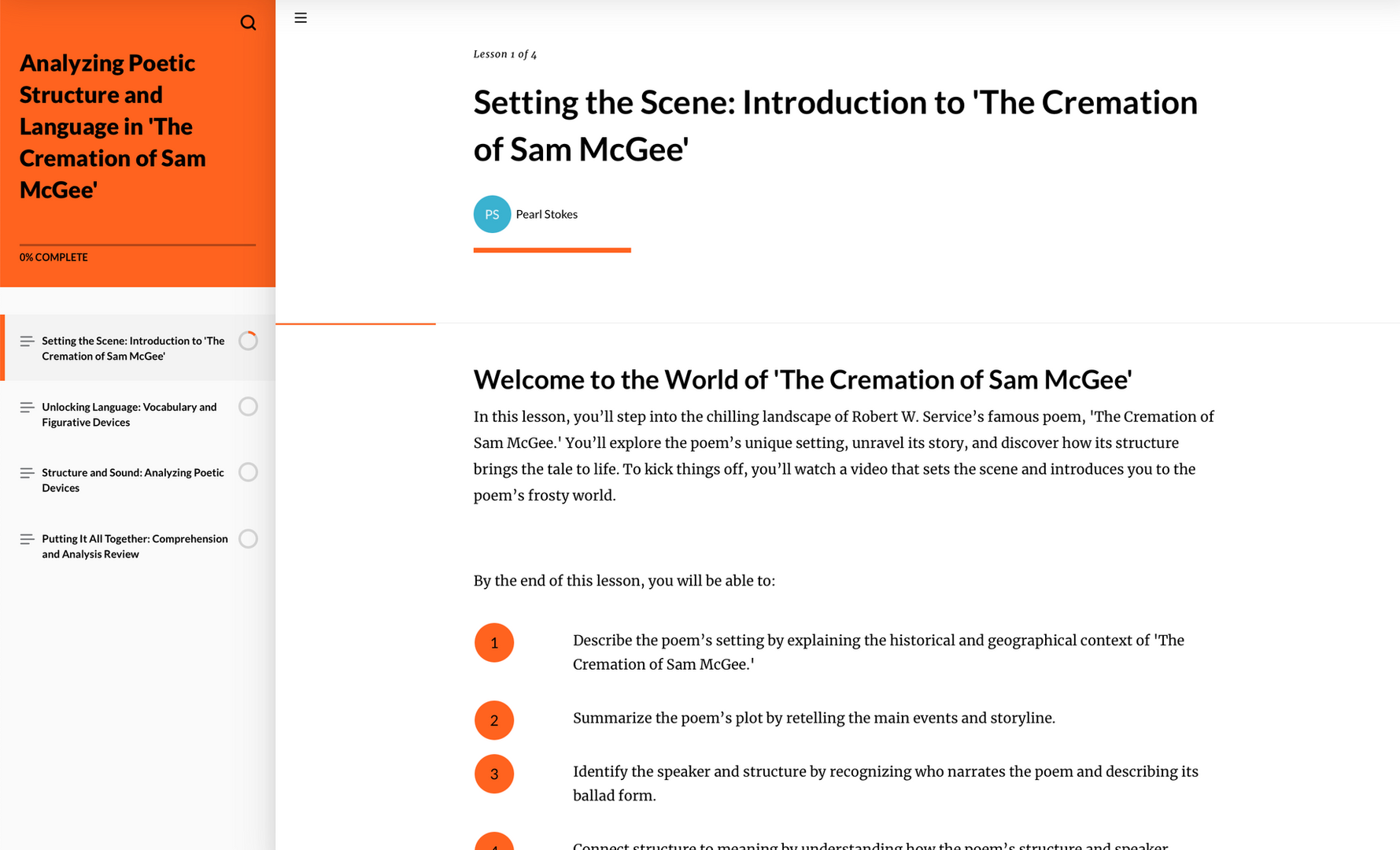 Utilizing Articulate 360/Rise, I created an interactive lesson that teaches students to identify elements like form, line length, and stanzas, as well as analyzing sound devices (rhyme, alliteration) and figurative language (metaphor, simile) to understand their effect on the poem's meaning and style.